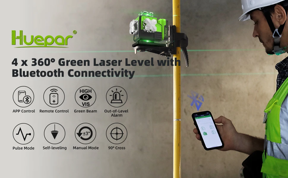 When connecting with Huepar APP and the Bluetooth Remote Control, the pulse mode can be switched ON/OFF via APP. Pulse mode extends the working range up to 200Ft in brighter working conditions when using with Huepar Line Laser Receiver. It is compatible with Huepar LR-6RG / LR-5RG Laser Detector only.