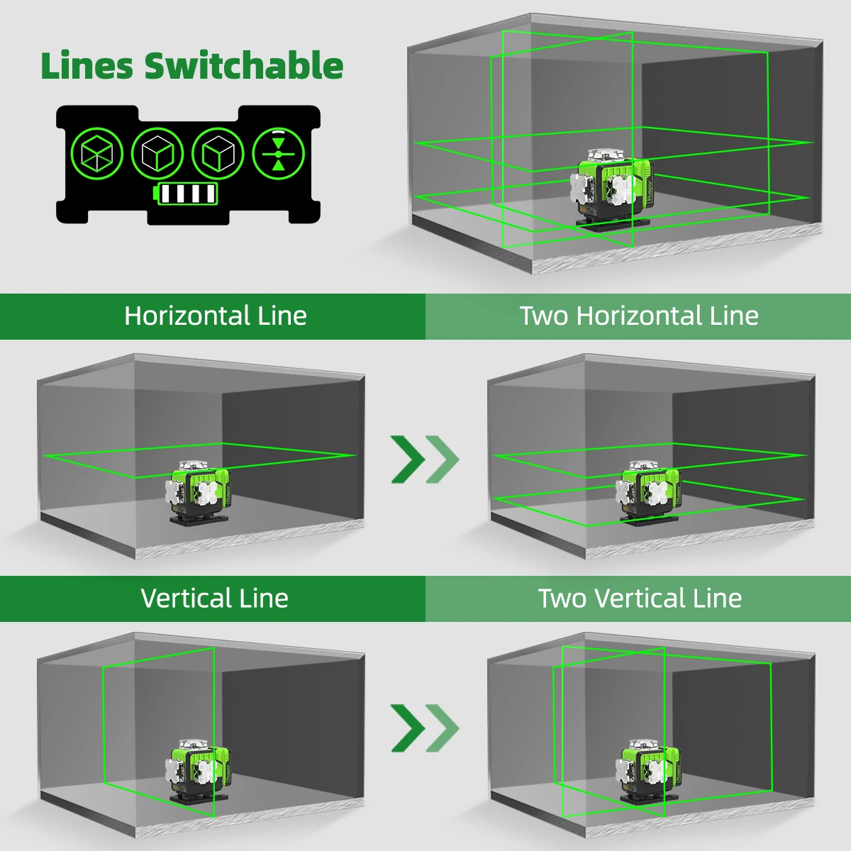 Huepar Laser Level have two horizontal 360° plane, two vertical 360° planes, 16 laser lines, which can cover the floor, walls and ceiling all around the room. Horizontal lines and vertical lines cross at 90°angles help you to visualize quickly and finish square layout. Each button on this laser level corresponds to a single laser line, you can easily choose to turn on/off any laser line.
